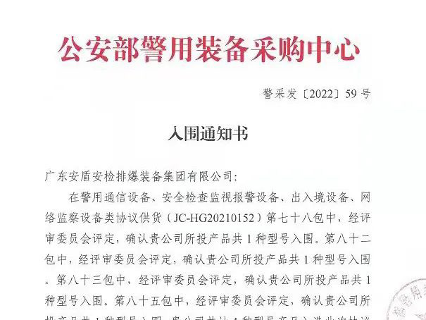 2022-02-28近日,在公安部警用裝備采購中心警用通信設備、安全檢查監視報警設備、出入境設備、網絡監察設備類協議供貨公開遴選項目中,廣東安盾安檢排爆裝備集團有限公司研發的X射線安全檢查設備、安檢門